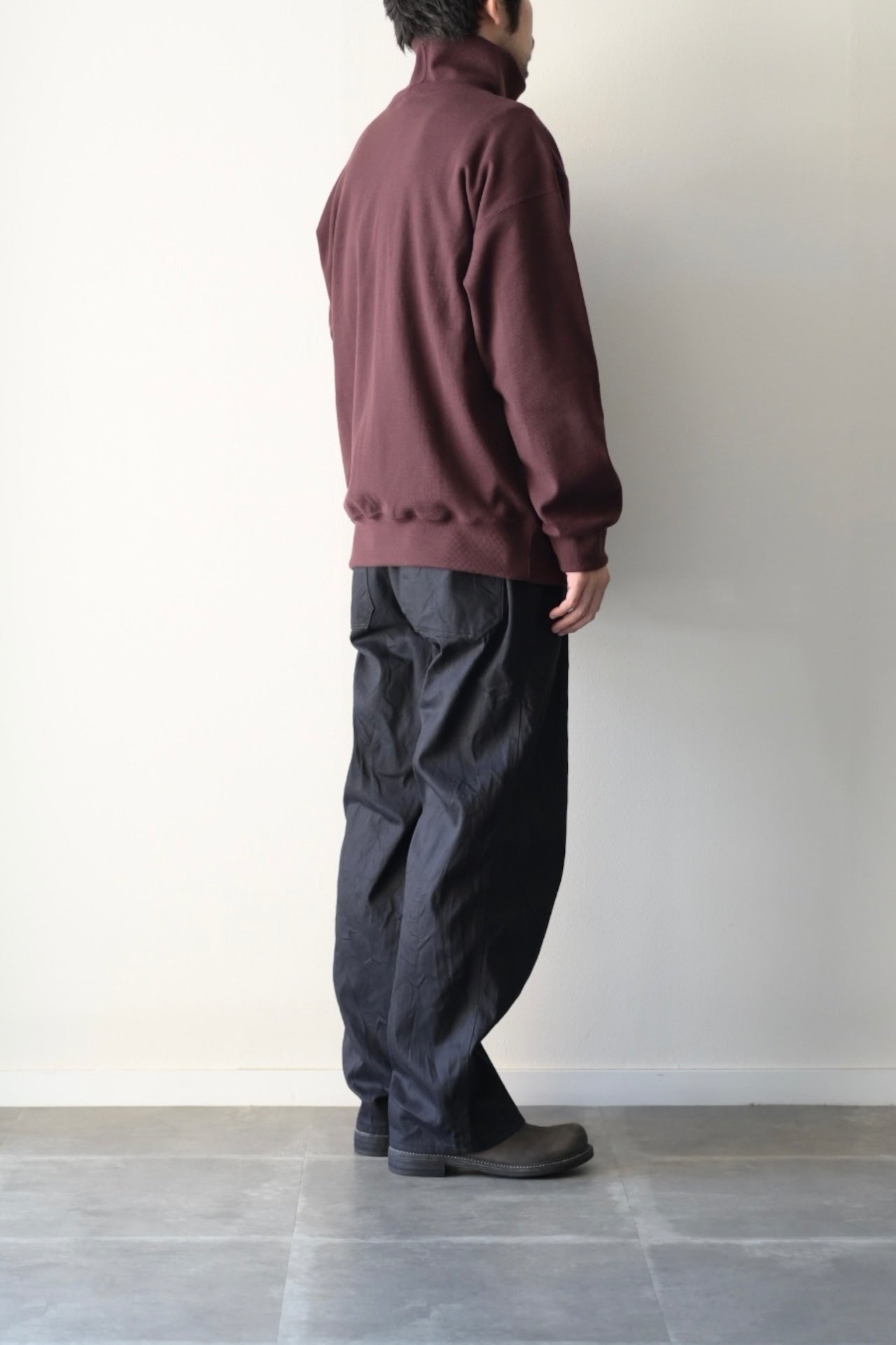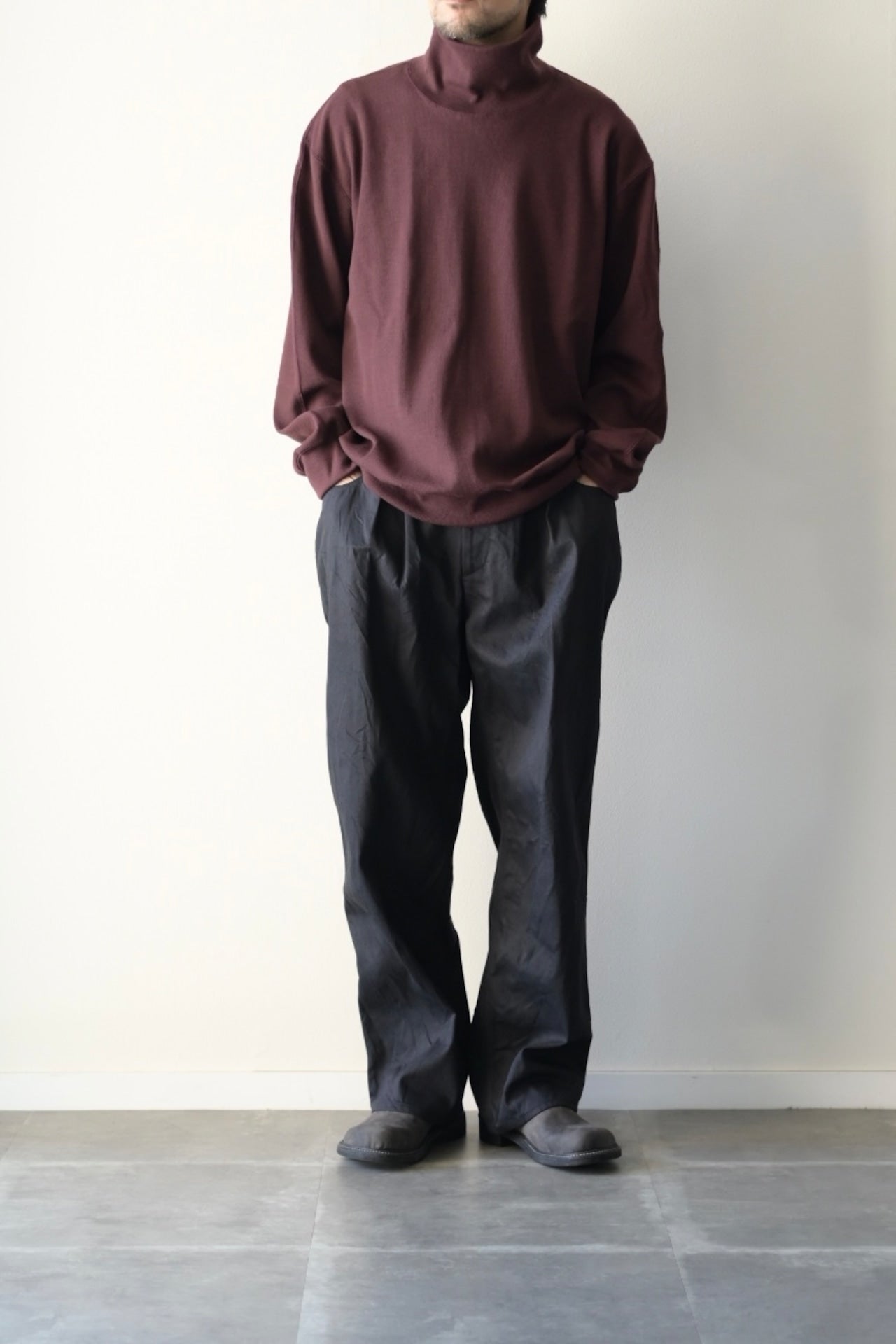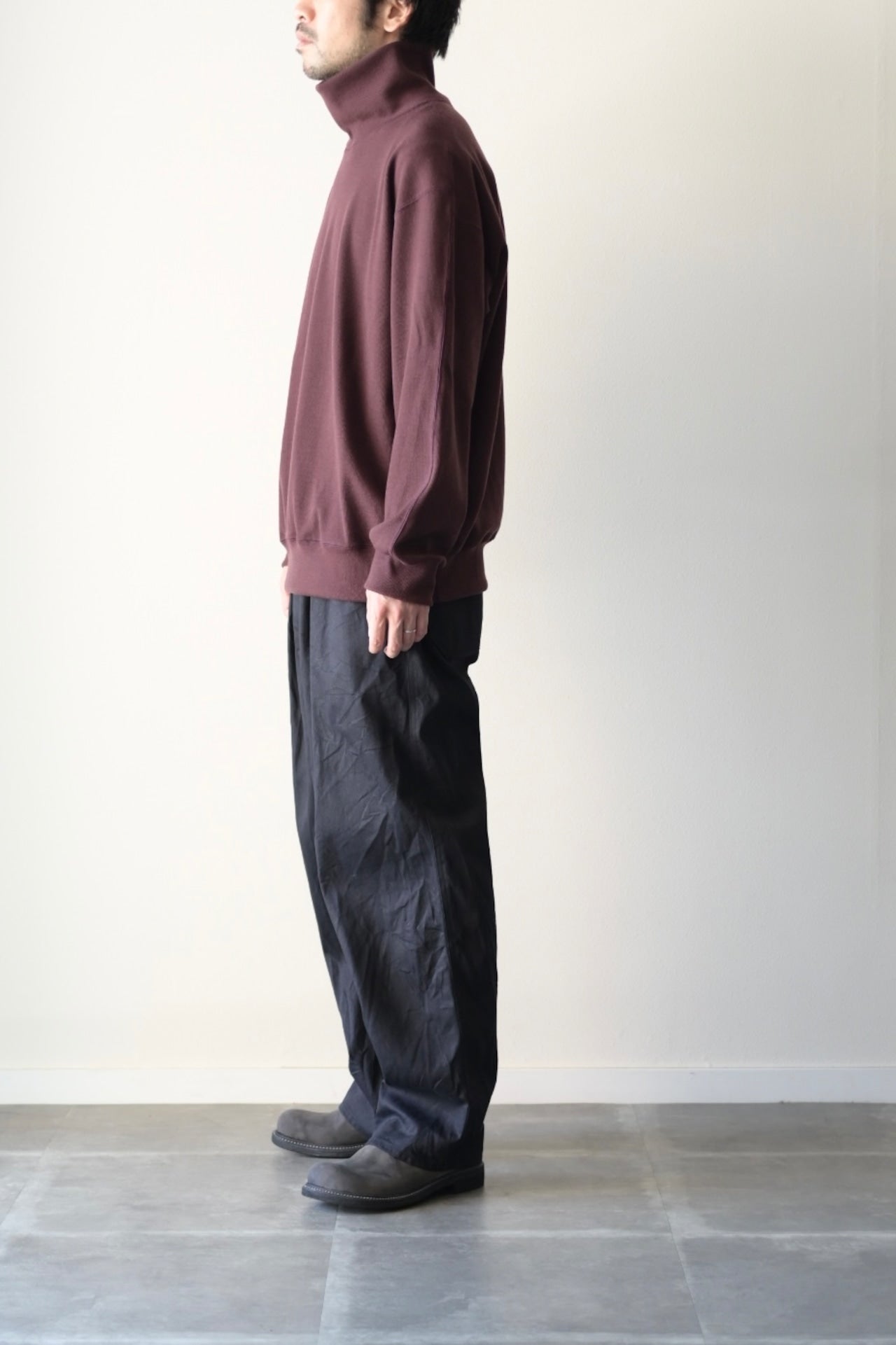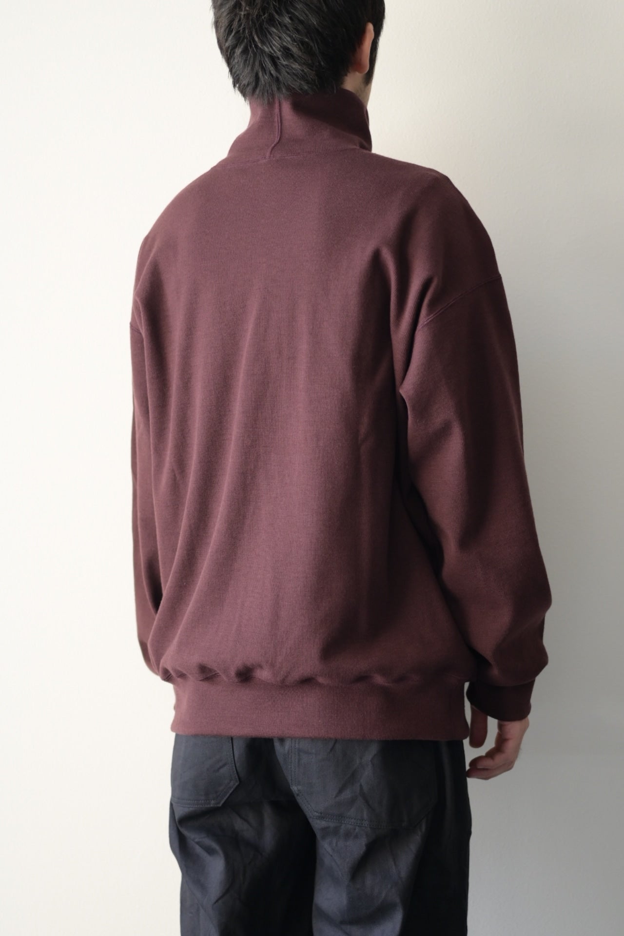 肩周り、身幅などボリュームのあるスペックで仕立てたタートルネックのプルオーバーアイテム。