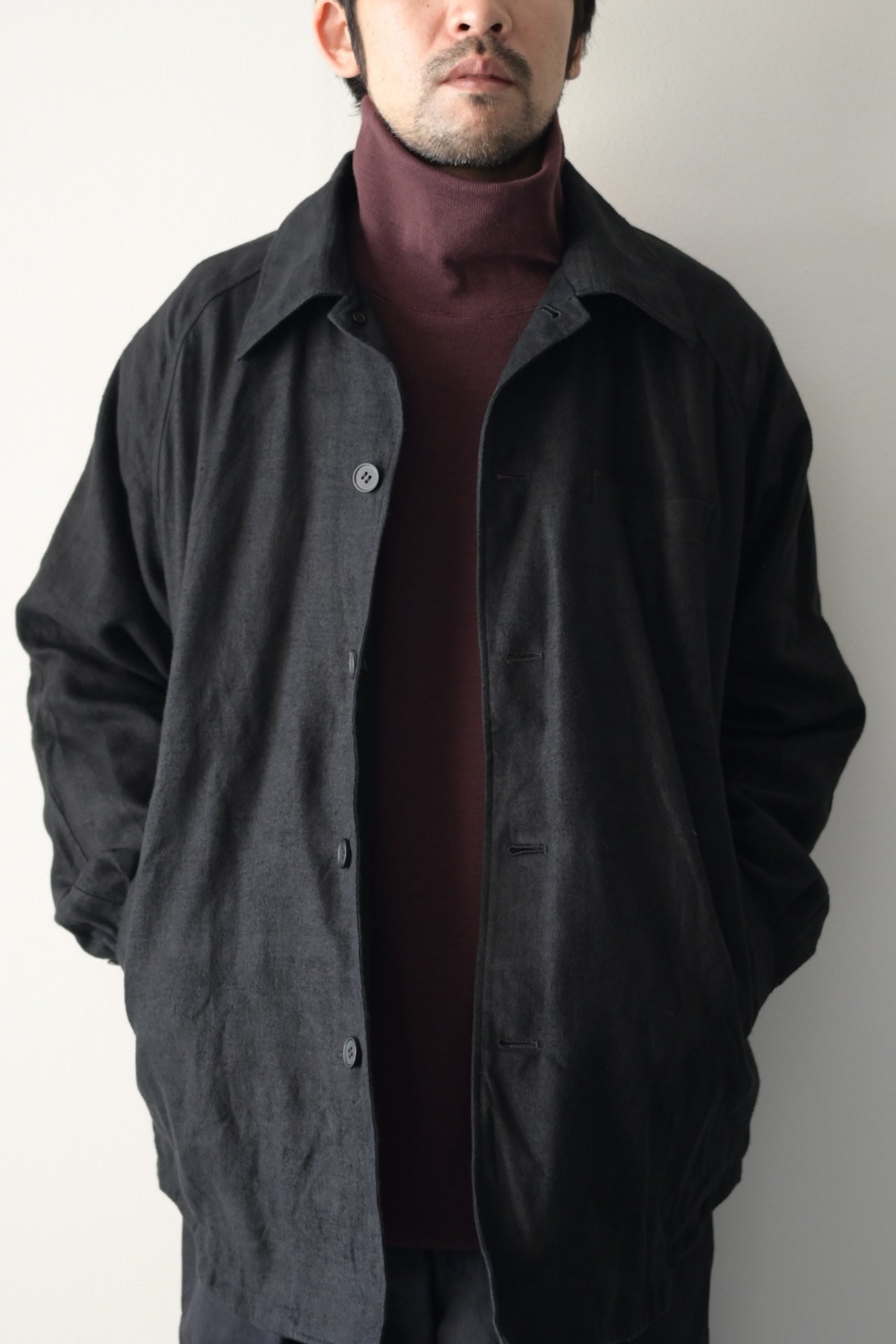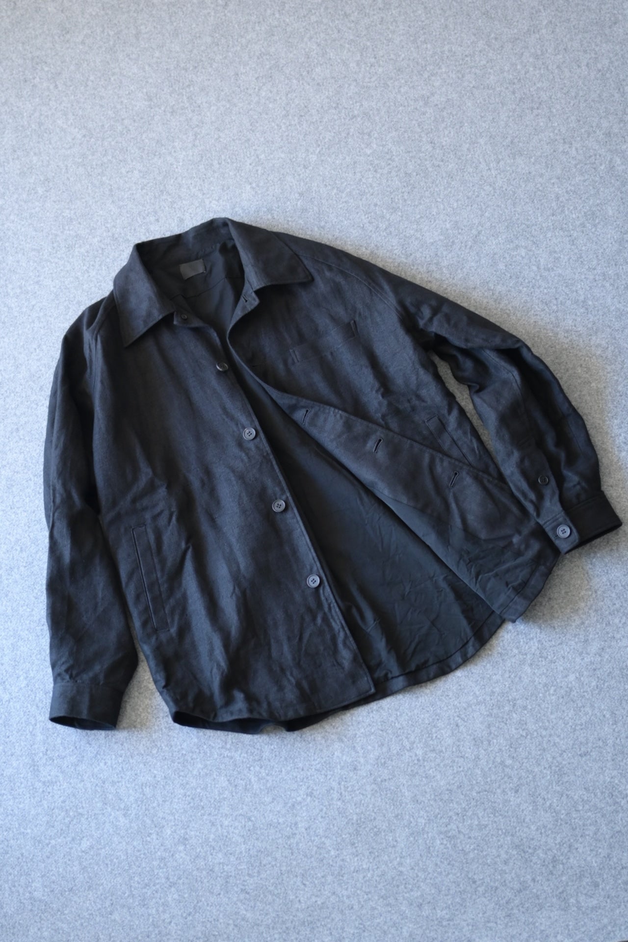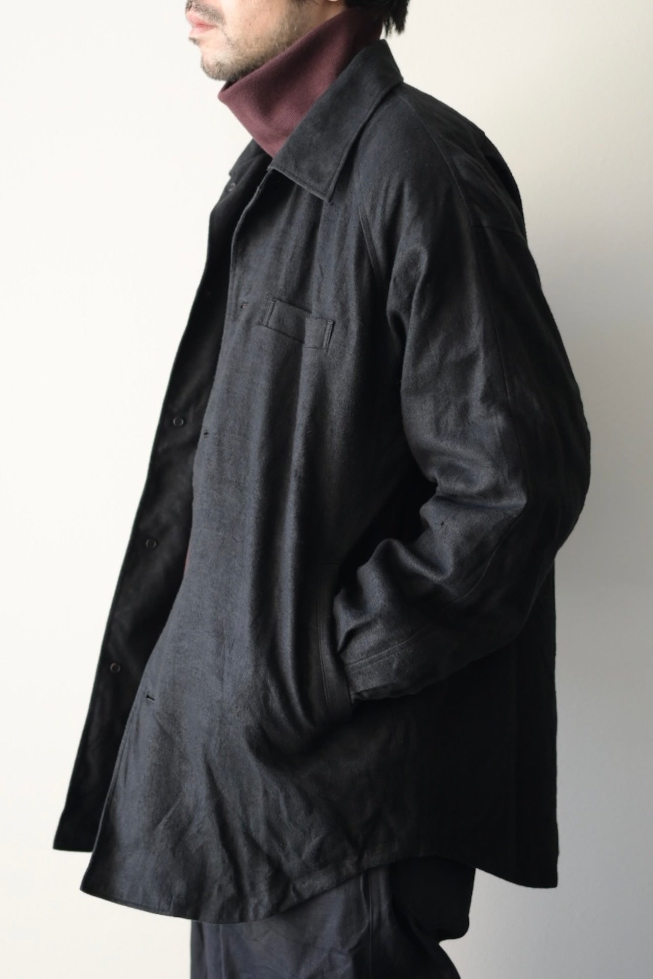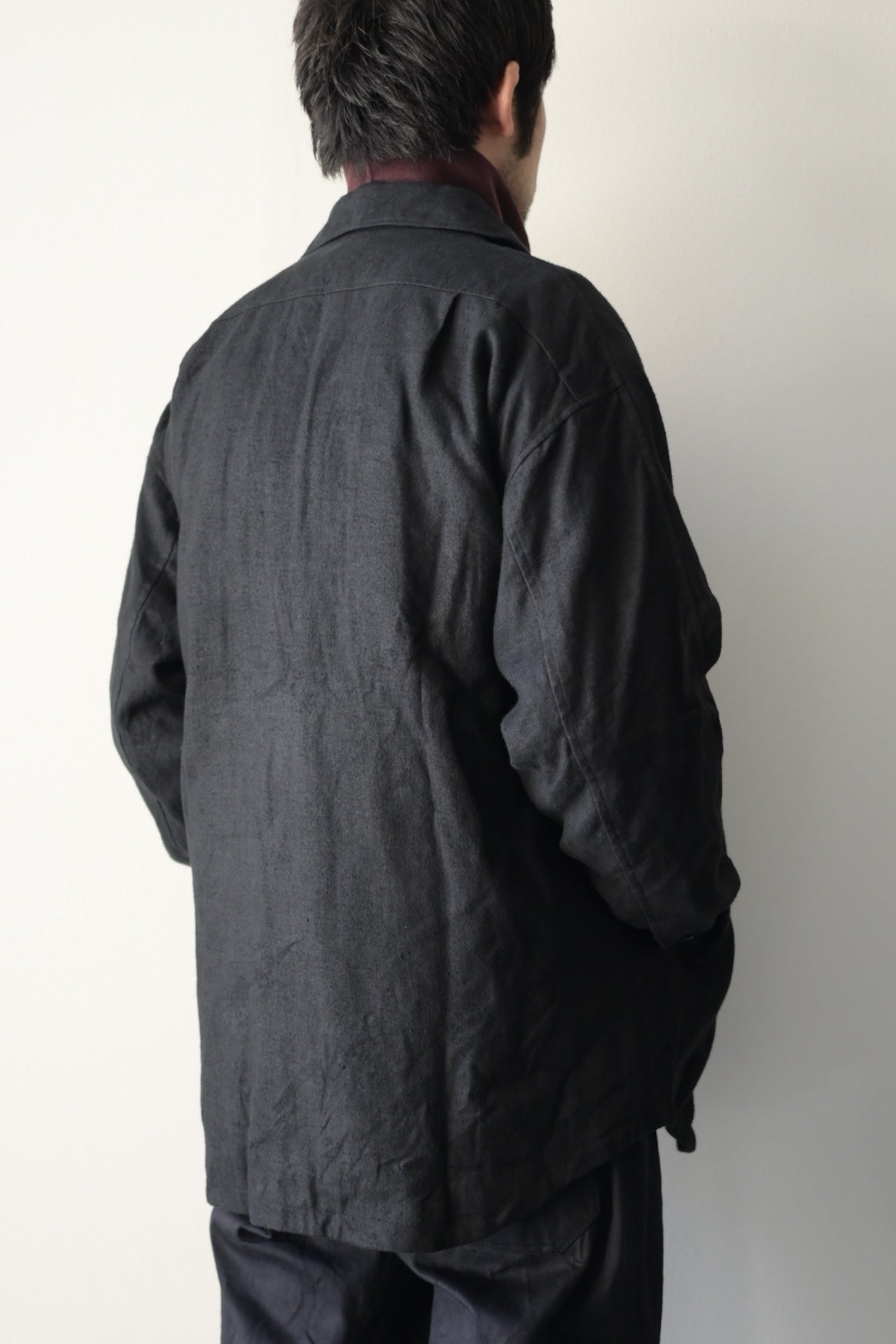 ある程度ゆったりしたパターン設計で、襟を少し大きめにデザインした総裏仕立てのシャツジャケット。