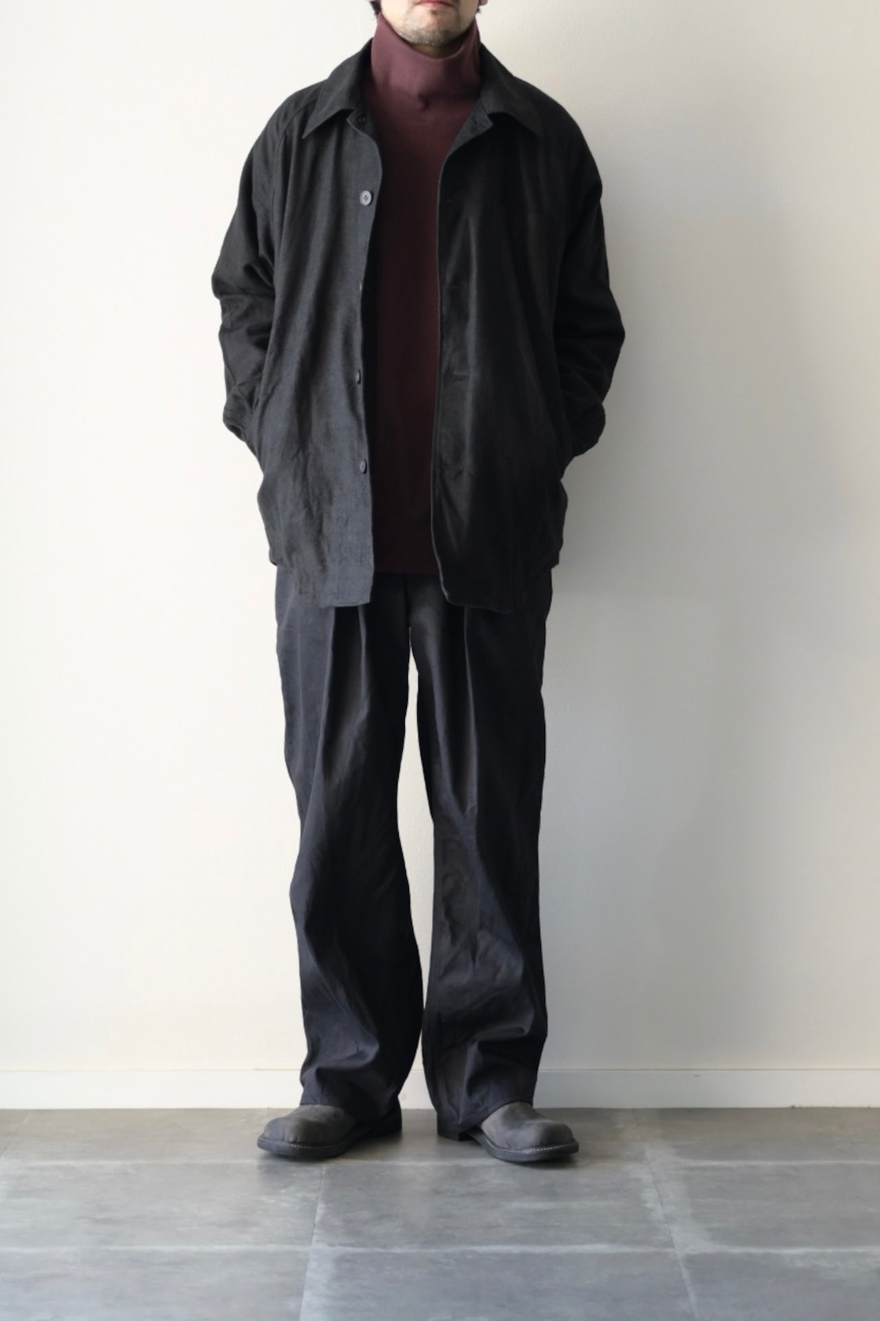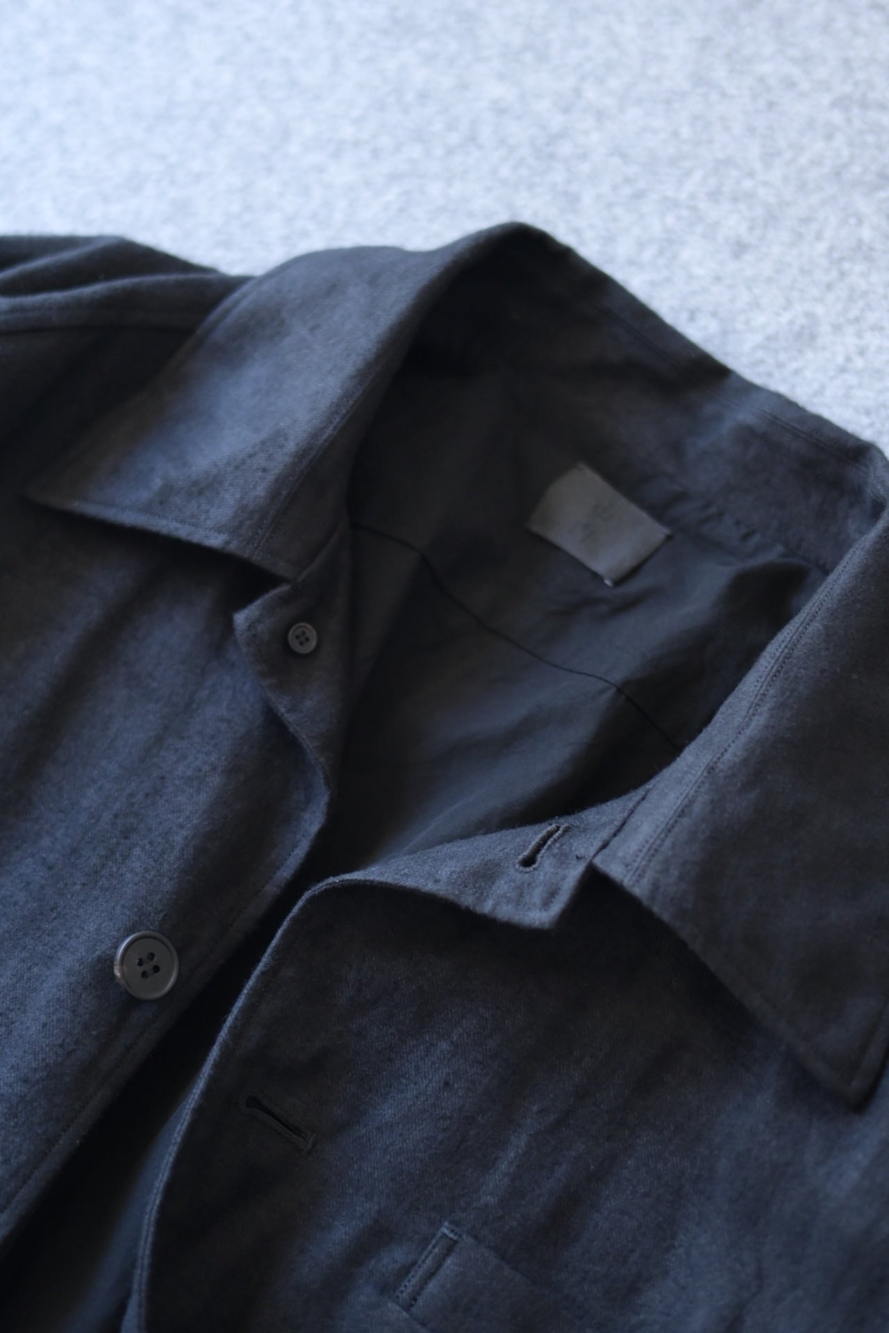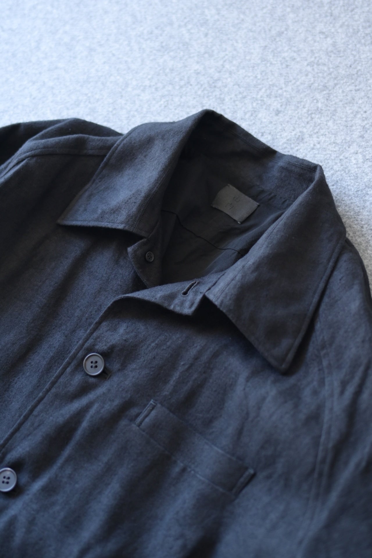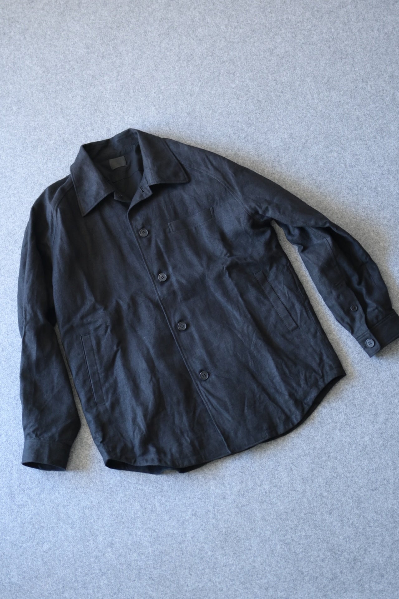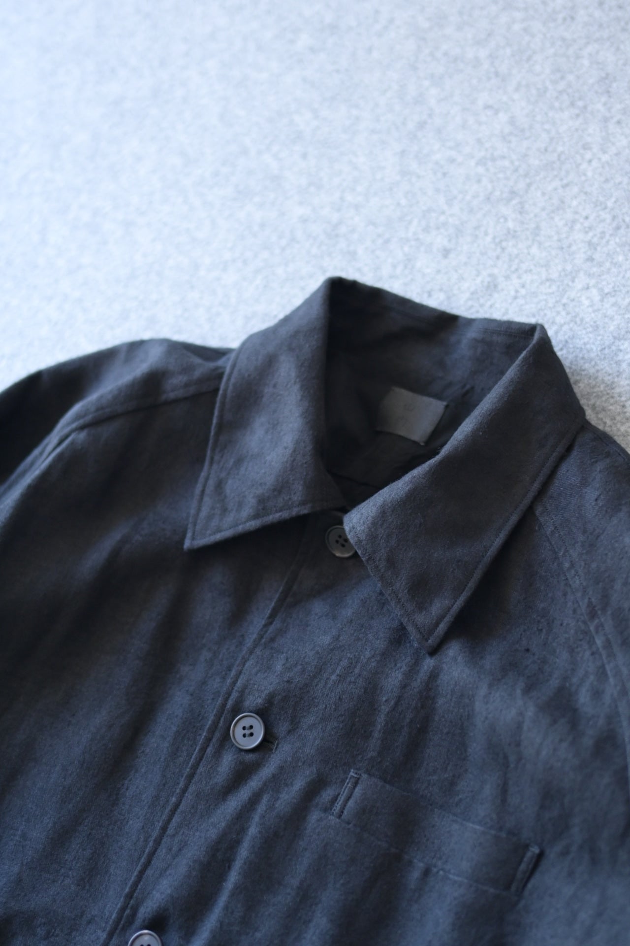 ある程度ゆったりしたパターン設計で、襟を少し大きめにデザインした総裏仕立てのシャツジャケット。
