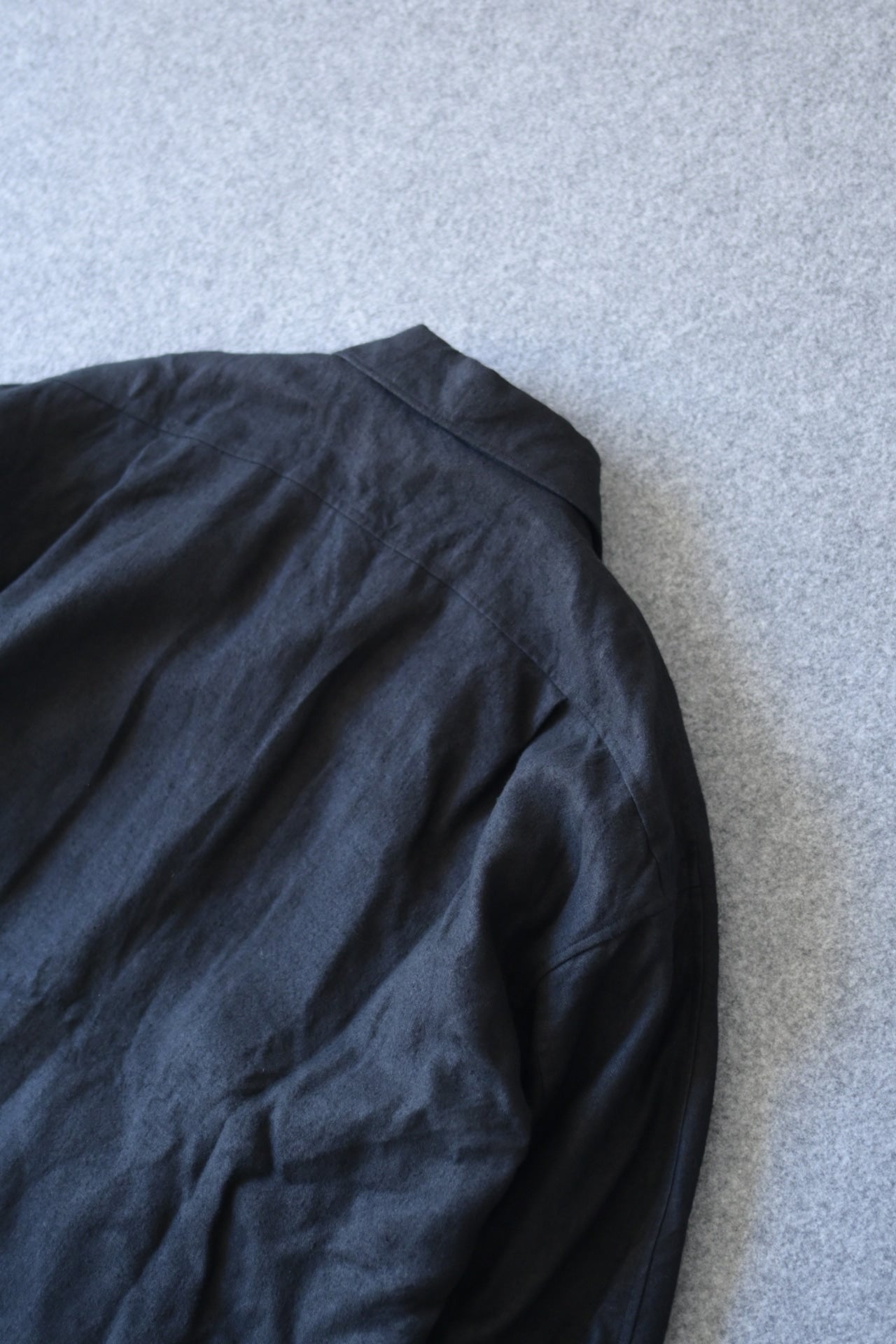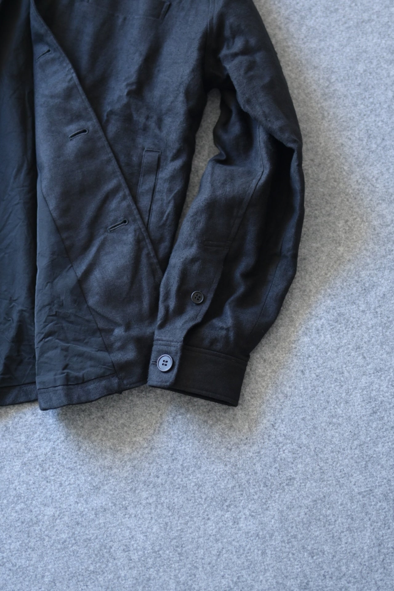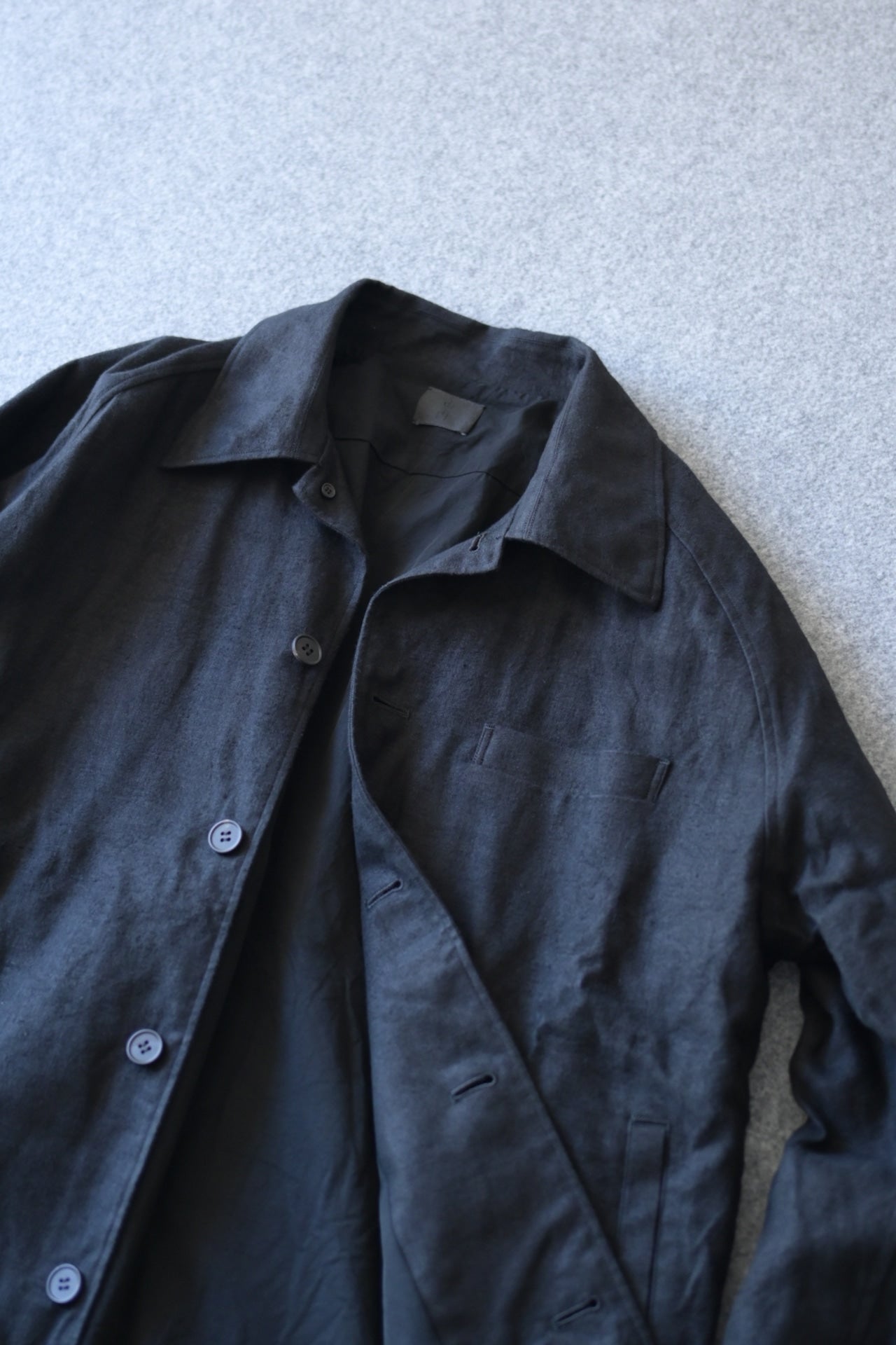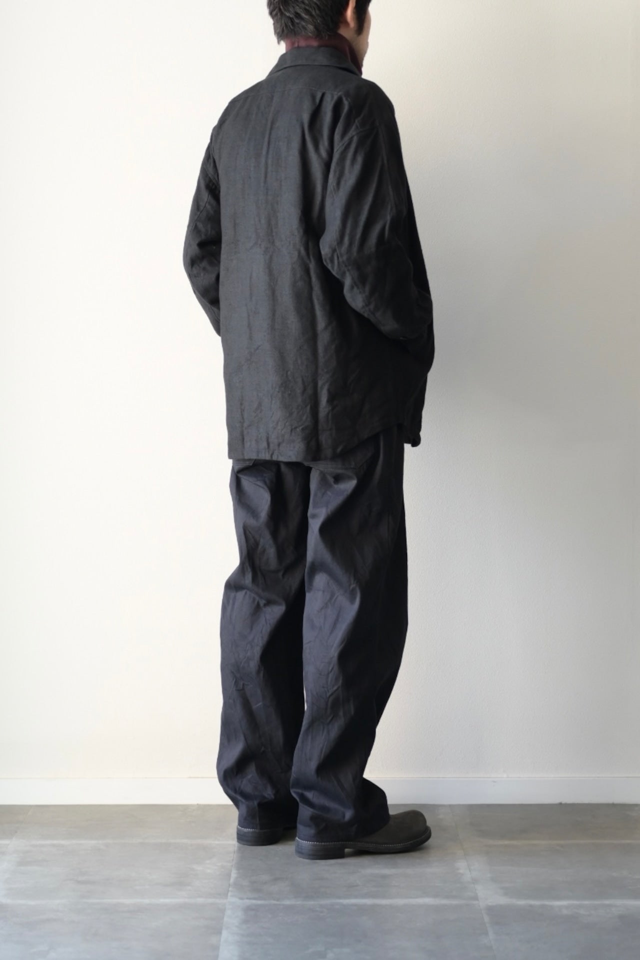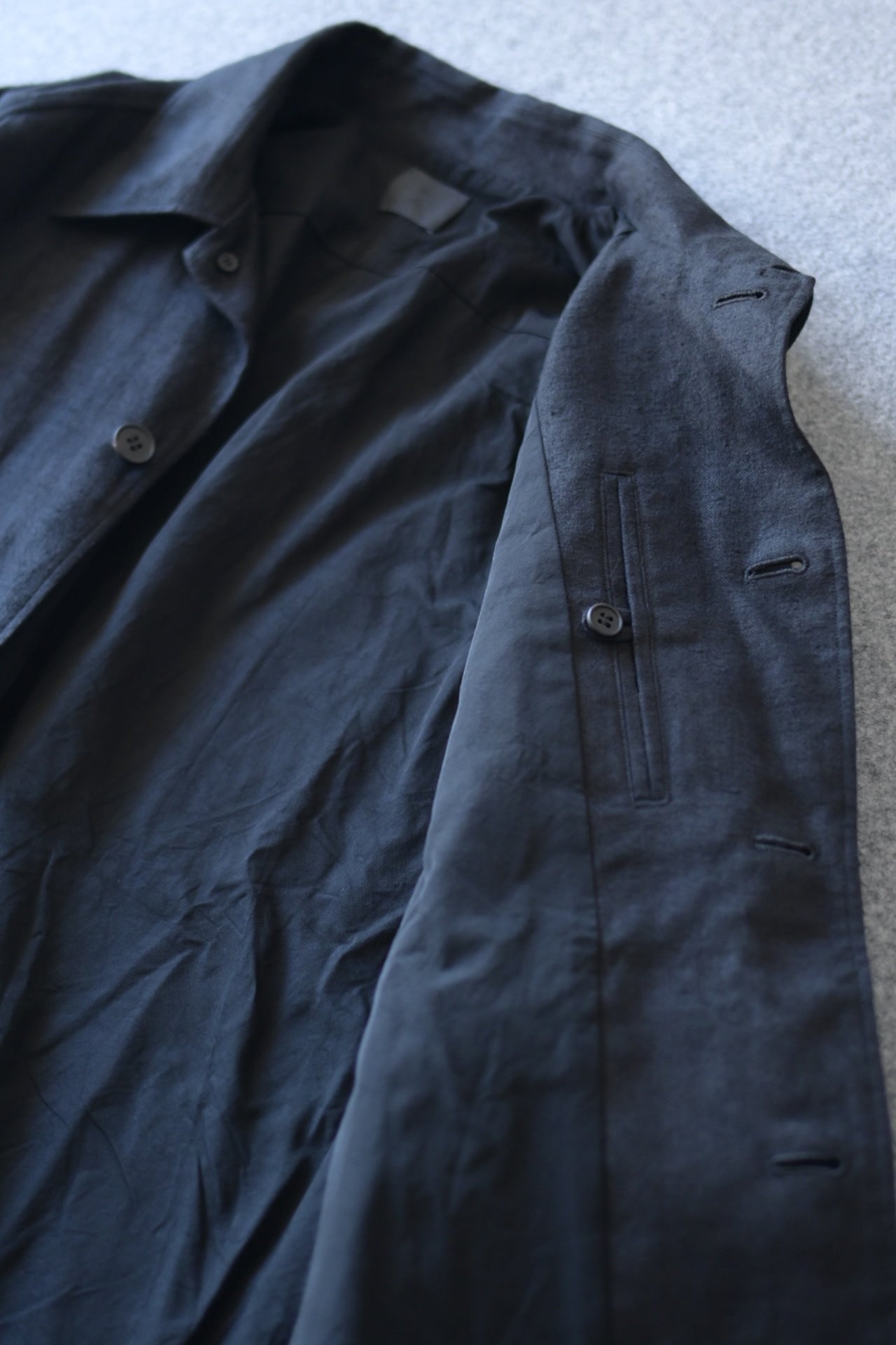 張りはあるが腰の抜けた生地感で、粗野な印象ですが、仕立て栄えするテキスタイルで弊社の得意とする縫製によってより存在感を増します。