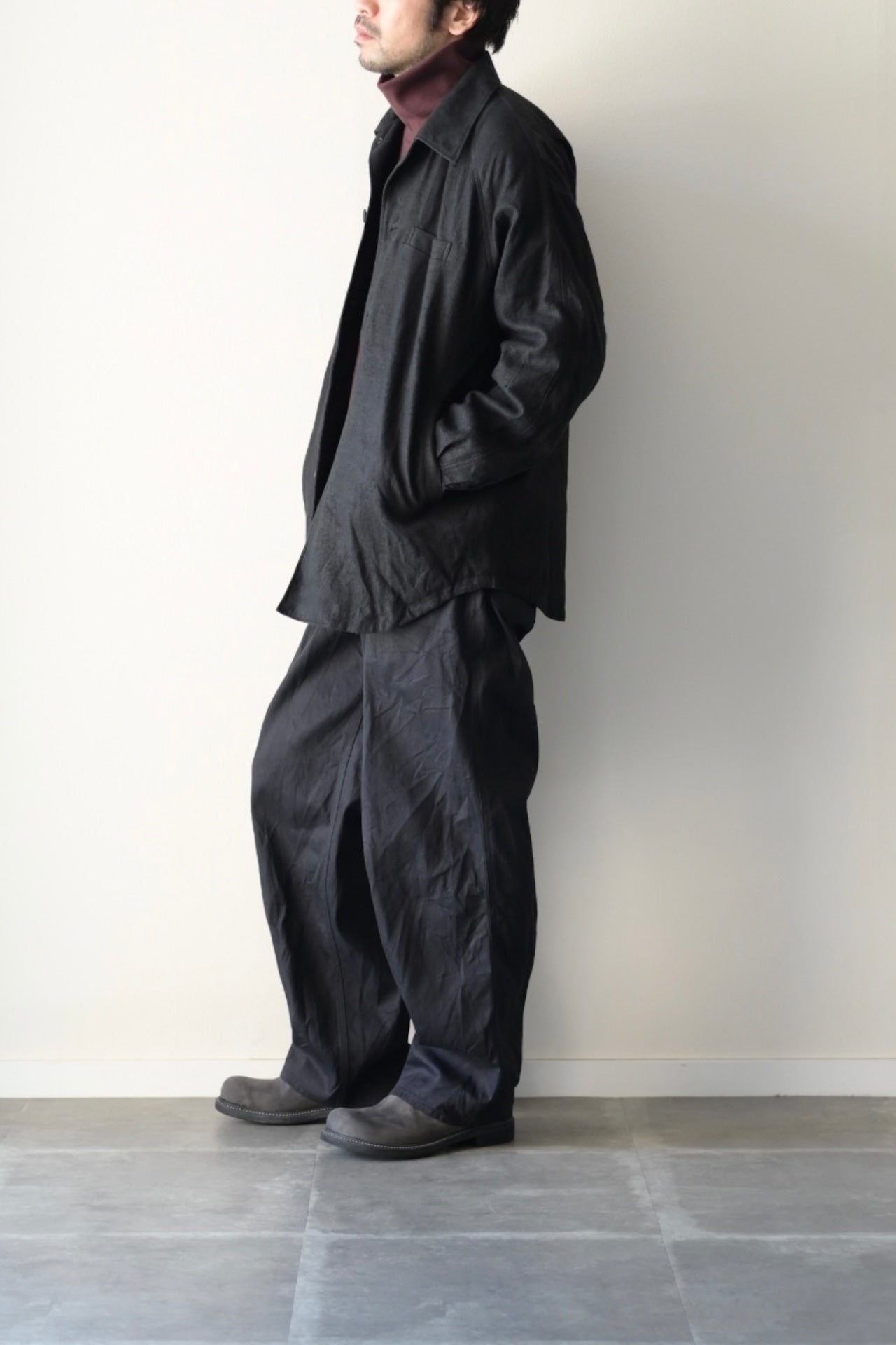 ヘンプ 特有の光沢感も表面起毛加工によりツヤが消え、男らしさを増しています。