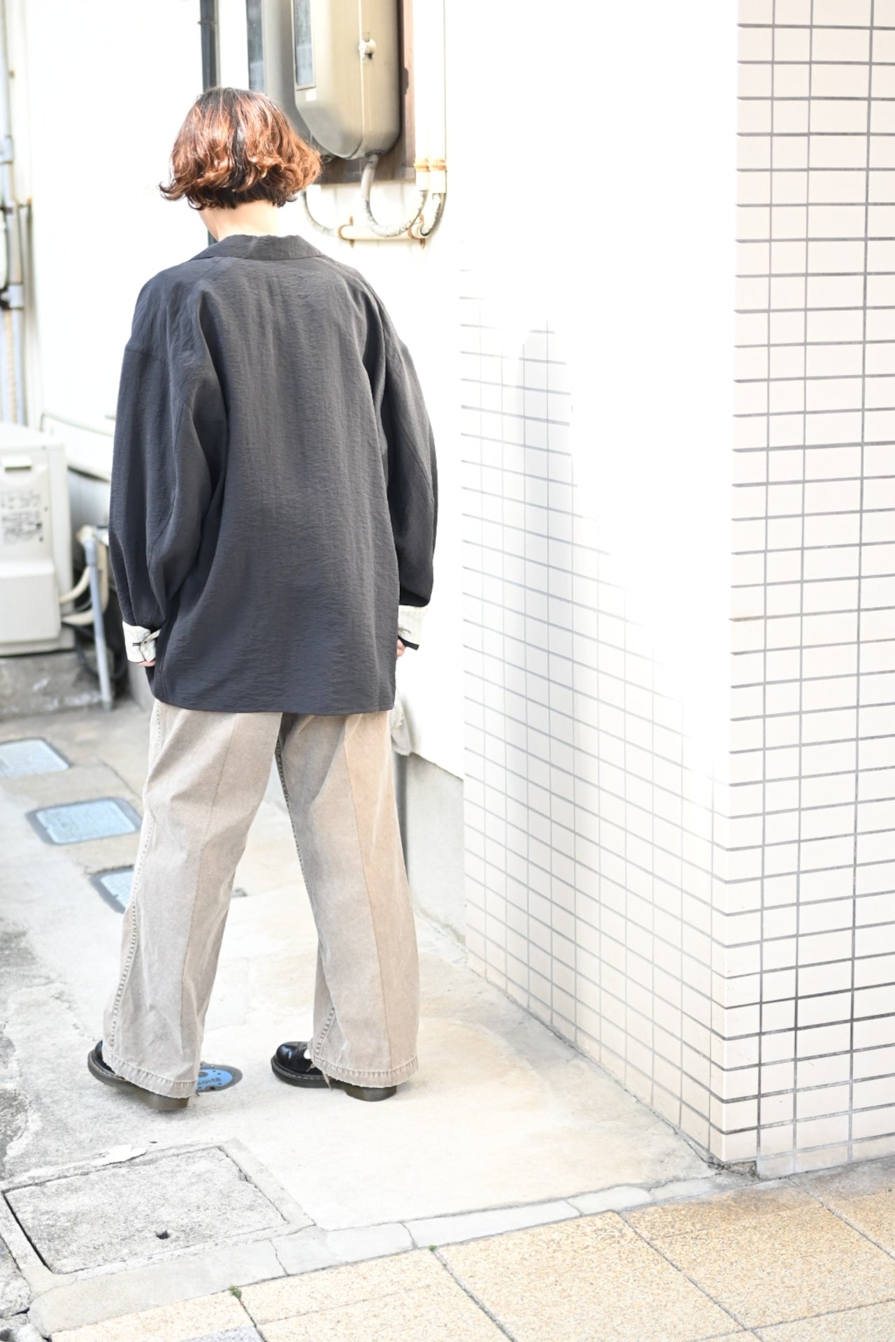 オープンカラーとラペルが合体したようなあいまいな衿がデザインポイント。フロントボタンは開けたままで着流すのがおすすめです。