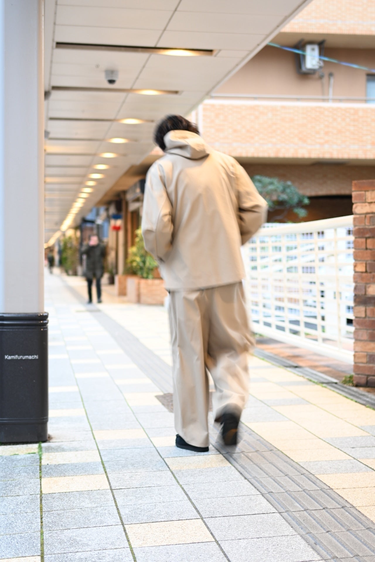フィンクスコットンの繊細な糸を3本撚り合わせることで、立体的な綾目が非常にきれいなギャバジンに仕上げました。強力なバイオ加工のニドム加工をすることで、高密度のしっかりとしたハリコシを柔らかく、ぬめり感のある独特なタッチに仕上げました。ニドム加工は、水中で生地を揉み叩き、酵素による分解によって独特の風合に仕上げる加工です。日本でもごく限られた加工場でしかできない希少な加工方法です。