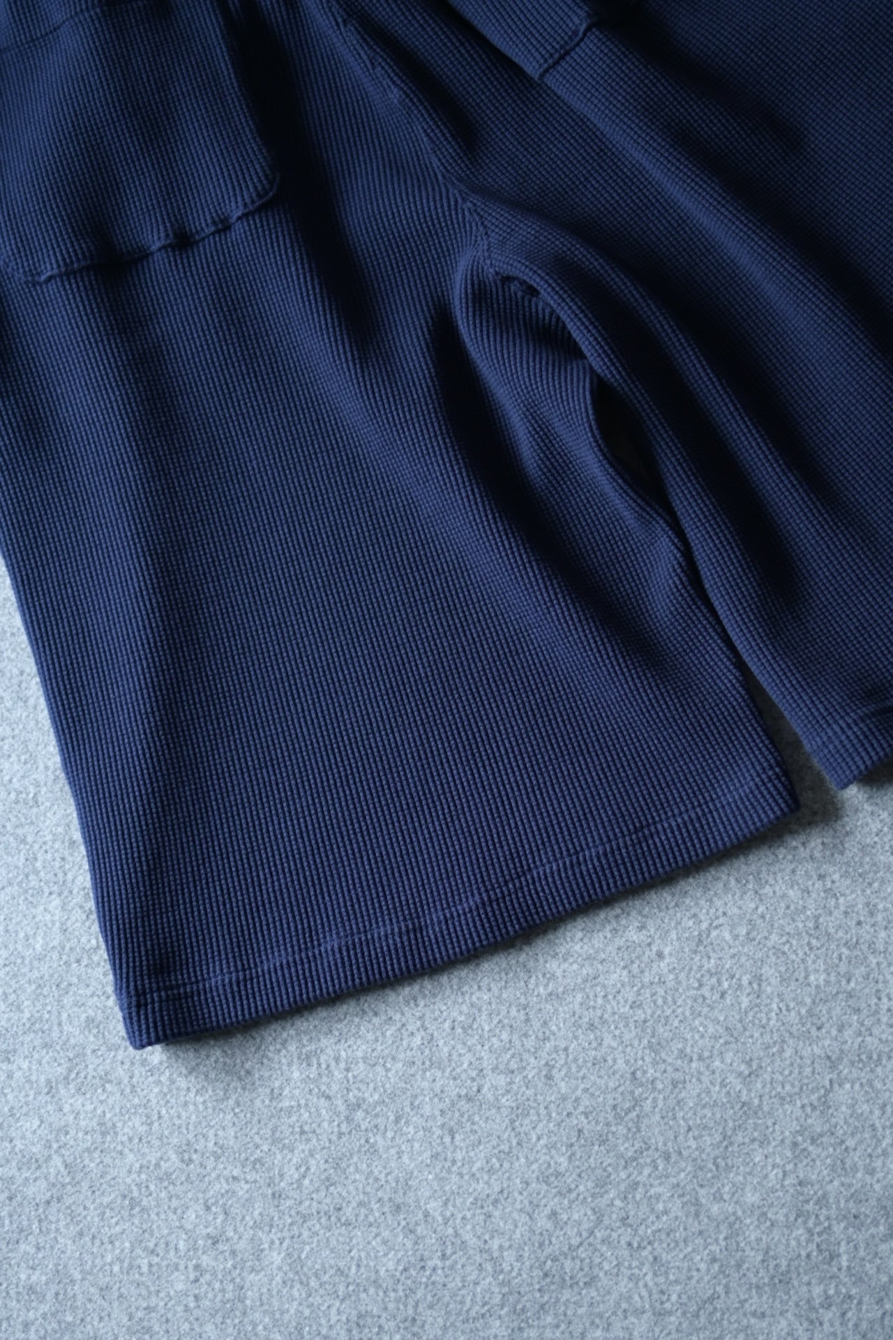 ここ最近は9月や10月も夏の延長のような日が続いているので、秋でもショートパンツを穿きたいと思い、ビッグショーツでワッフル素材なら秋冬のアイテムとも相性が良く、長袖のシャツや同素材の長袖のワッフルカットソーと合わせて着たいと着想しました。